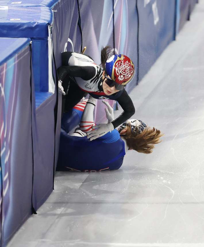 김길리는 펜스에 부딪히며 쓰러졌고, 고통 속에서도 손을 뻗어 최민정에게 터치를 했습니다.