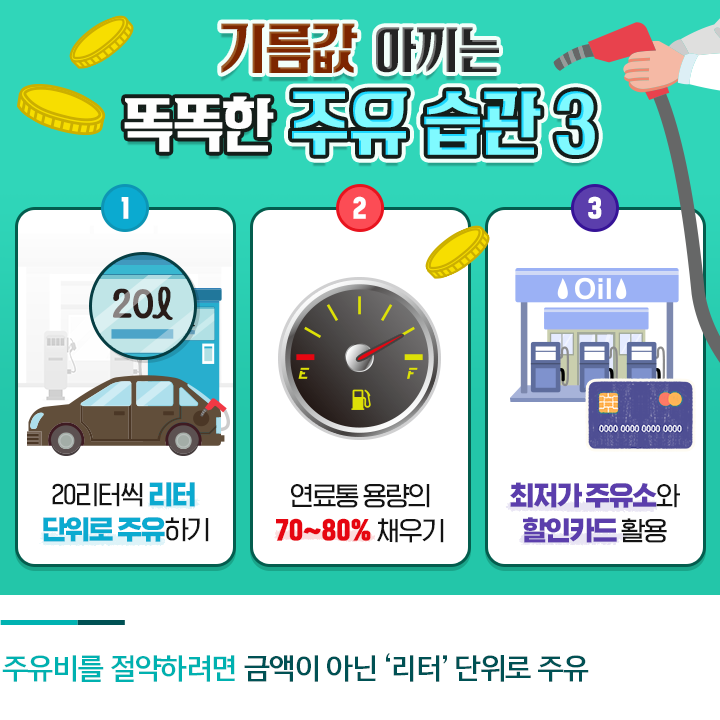 단순히 가격이 내리기만을 기다리기보다는 ① 오피넷 앱으로 최저가 주유소 찾기 ② 급가속·급제동 줄이기 ③ 경차 환급 및 할인카드 사용하기를 통해 능동적으로 대처하는 것이 가계 경제를 지키는 지름길입니다.