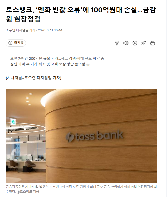 | 토스뱅크 실질 손실 추산 | 약 100억 원 | 정상 환율 차액 기준 |