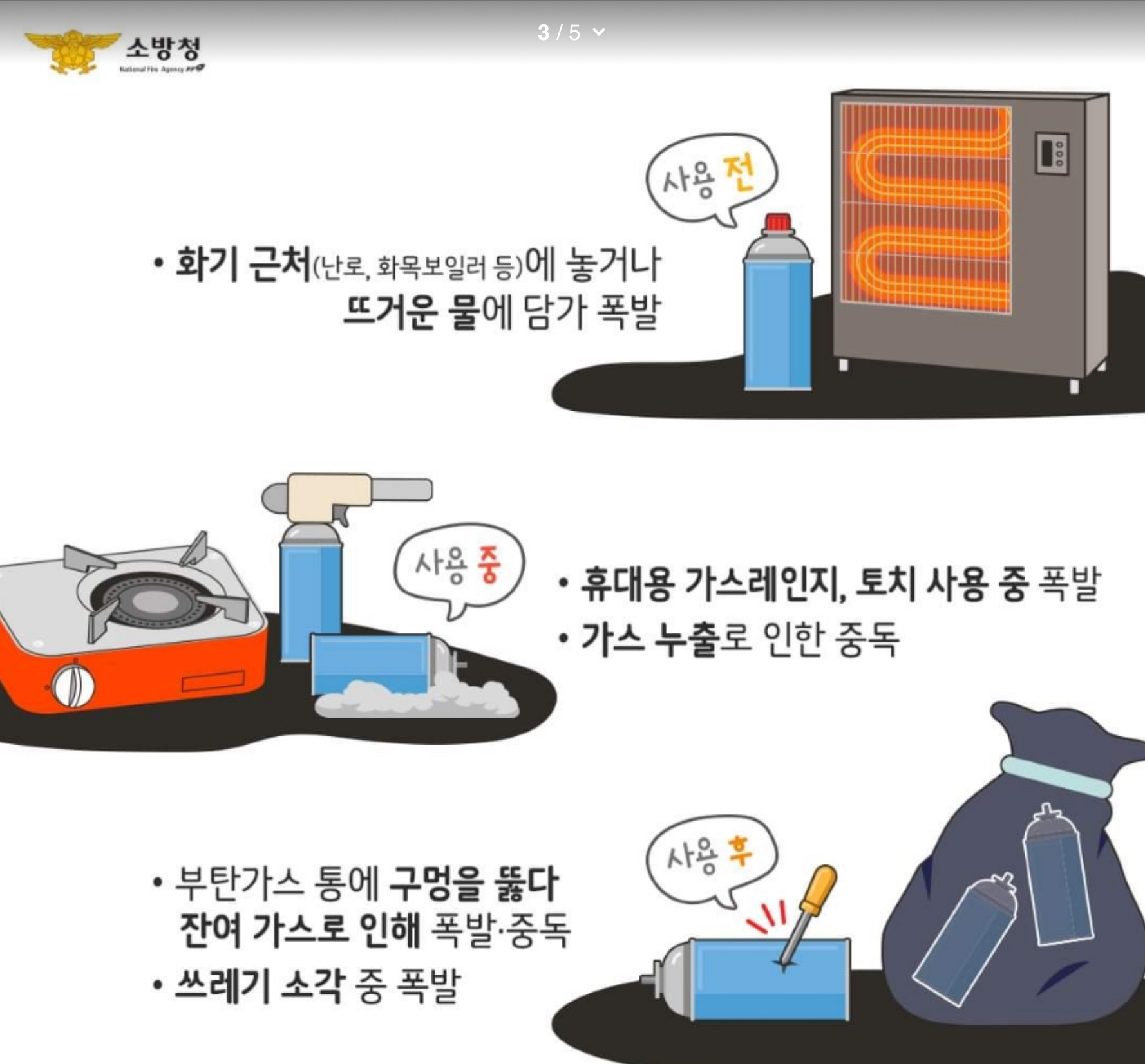 "다 쓴 통인데 뭐" 하시며 난방기구 근처에 두시는 분들 계시죠? 열이 가해지면 내부 압력이 올라가서 폭발할 수 있어요. 겨울철 사고의 62%가 화상으로 이어졌습니다.