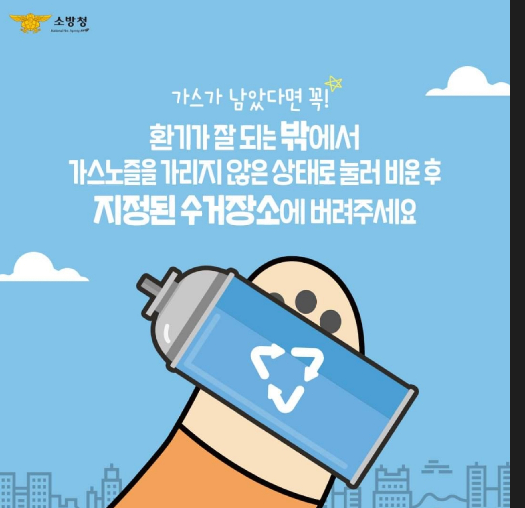 오늘 내용만 기억하세요. 야외에서 노즐로 가스 배출 → 10분 대기 → 캔류 분리배출.