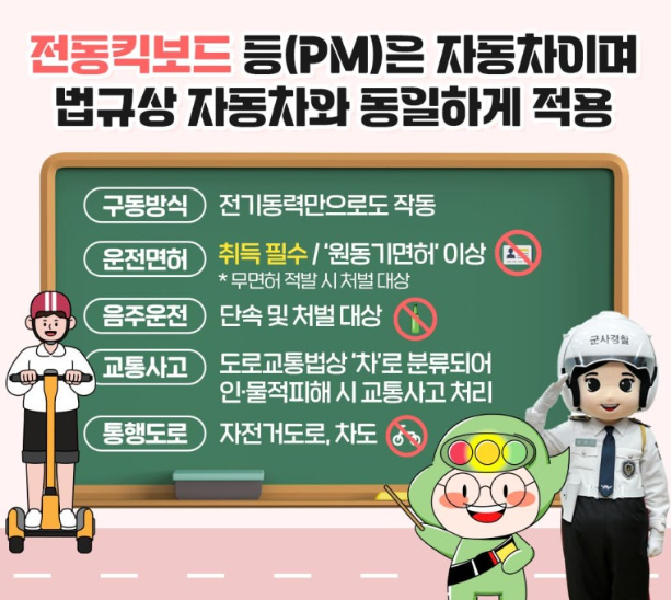- 면허 확인 의무화 - 공유 킥보드 대여사업자는 이용자의 면허 소지 여부를 반드시 확인하도록 의무화, 위반 시 최대 500만원 과태료 부과