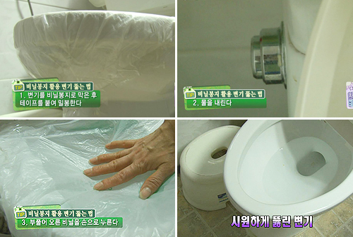 1. 변기 입구를 비닐로 완전히 밀봉합니다 (공기 샐 틈 없이)