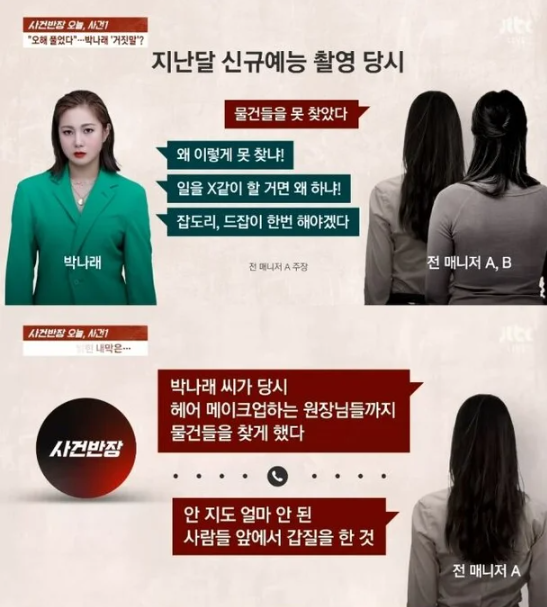 지난해 촬영 현장에서 박나래가 메이크업 원장과 스태프들이 모두 있는 자리에서 매니저들에게 "일을 X같이 할 거면 왜 하냐"는 폭언을 했다는 증언이 나왔습니다. 이는 단순한 지적을 넘어선 인신공격으로 해석됩니다.