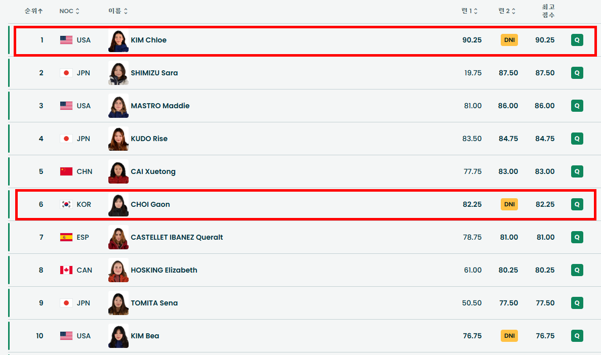 예선에서 클로이 킴은 90.25점으로 1위, 최가온은 82.25점으로 6위로 결승에 진출했습니다.