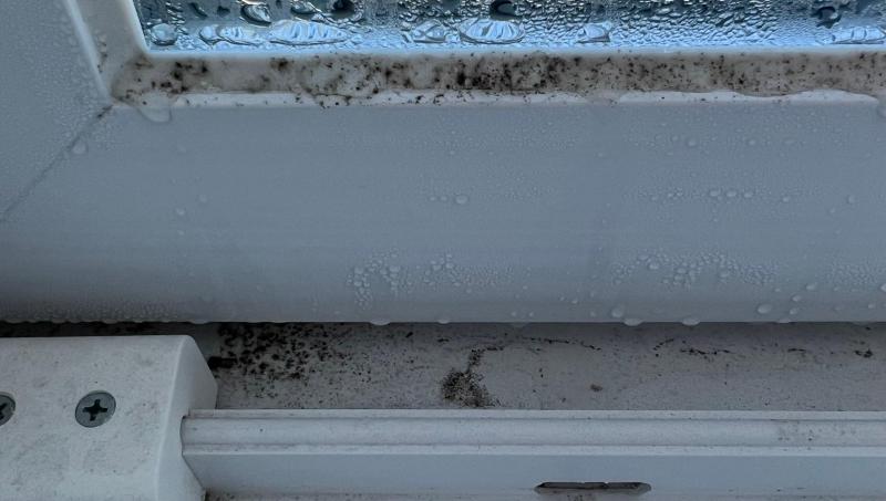 따뜻하고 습한 실내 공기가 단열이 부족한 차가운 창문이나 외벽 모서리에 닿아 충분히 식으면서 물방울(결로)로 변하는 것입니다.