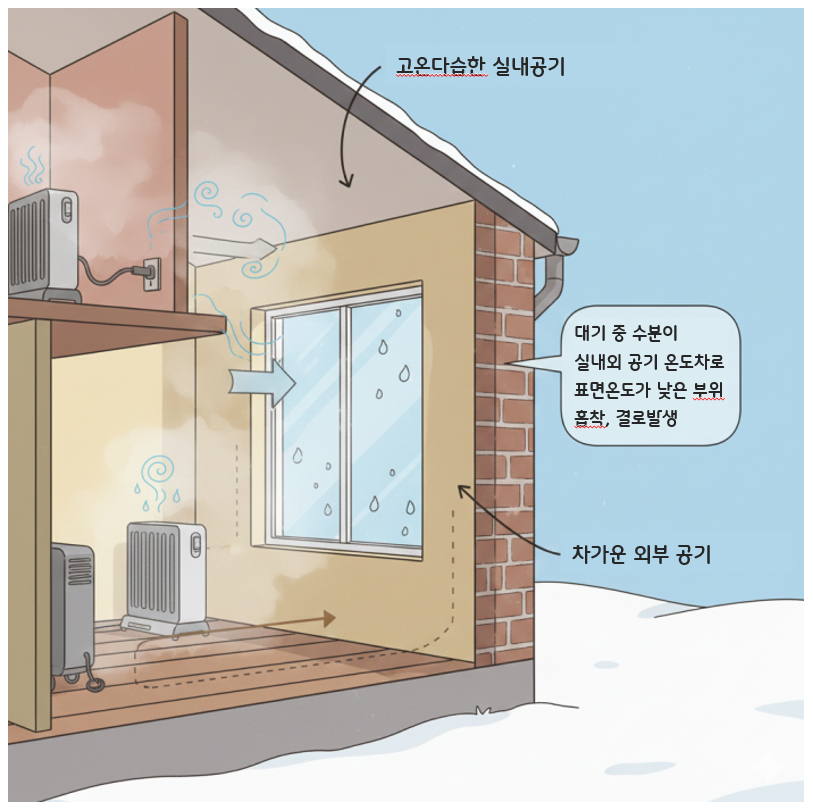 | 낮은 표면 온도 | 외부와 맞닿은 창문, 벽 모서리 | 실내 수증기가 빠르게 식는 접점 |