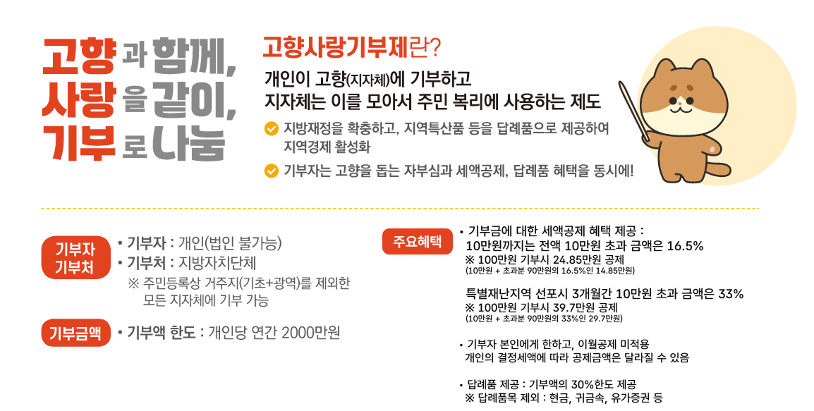 '고향사랑기부제'로 지자체에 10만원을 기부하면, 연말정산 때 10만원 전액 세액공제(세금 100% 깎아줌)를 해줍니다. 여기에 답례품(지역 특산물) 3만원어치를 추가로 드리구요.
