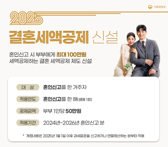 2024년~2026년 사이에 혼인 신고를 했다면? 최대 100만원(부부 합산)을 세액공제해 줍니다.
