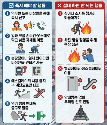 지하철 역사에서 화재·연기가 발생했을 때 패닉 없이 행동하는 것이 가장 중요합니다.