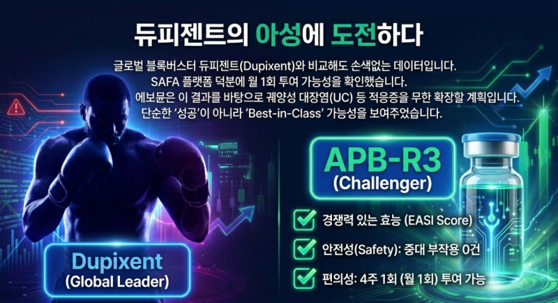 A: 경쟁이라기보다는 작용 기전이 다릅니다. 듀피젠트는 하위 염증 신호(IL-4, IL-13)를 억제하고, APB-R3는 최상위 조절자(IL-18)를 타깃으로 합니다. 오히려 병용 요법의 가능성도 있습니다.