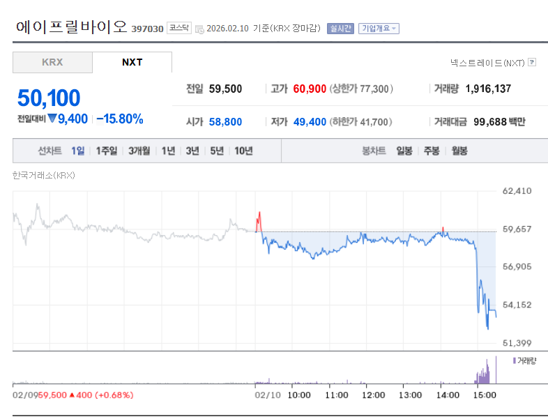 그 결과 2월 10일 에이프릴바이오는 15.80% 급락하게 되었습니다.