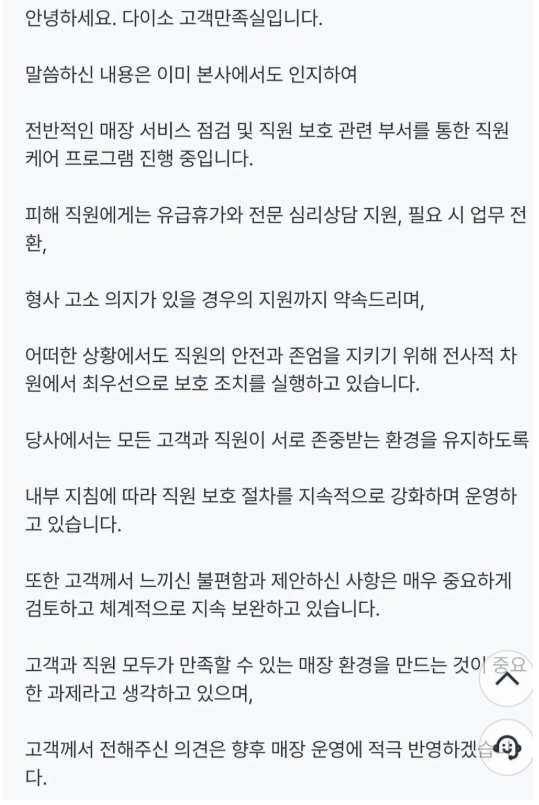 "다이소는 모든 직원이 안전하고 존중받는 환경에서 일할 수 있도록 최선을 다하고 있습니다. 이번 사건과 같이 직원의 인권이 침해되는 상황에서는 회사가 직원을 적극적으로 보호하겠습니다. 또한 전 매장을 대상으로 서비스 점검과 직원 보호 절차를 강화하고 있으며, 고객과 직원이 서로 존중하는 문화를 만들기 위해 내부 지침을 재정비하고 있습니다."
