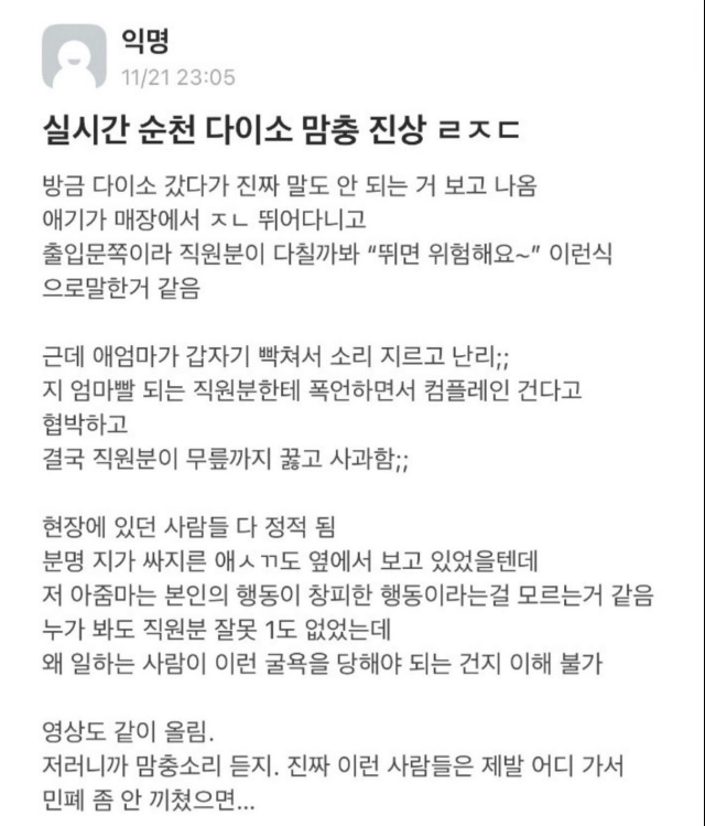 • 사건 발단: 순천 다이소에서 뛰어다니는 아이에게 "위험해요" 주의한 중년 직원