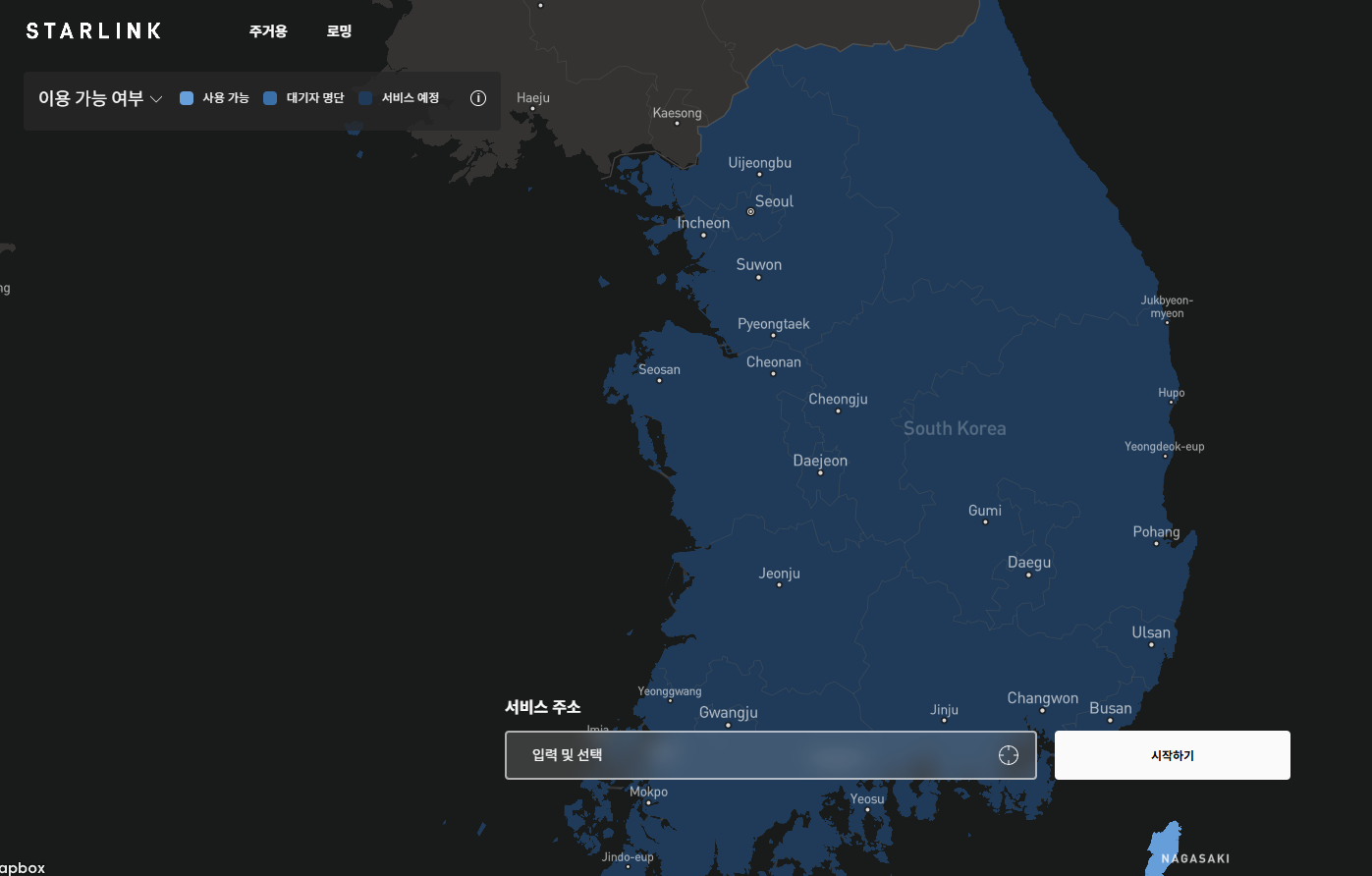 스타링크 홈페이지 캡쳐 한국은 거의 모든 지역이 사용가능