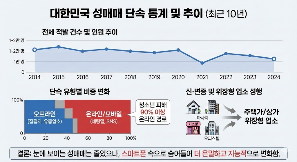 기존 집창촌(특정 구역 집결지)은 감소했지만,스마트폰과 SNS 등을 이용한 비대면 성매매가 급증했습니다. 단속의 사각지대가 오히려 넓어진 셈이에요.