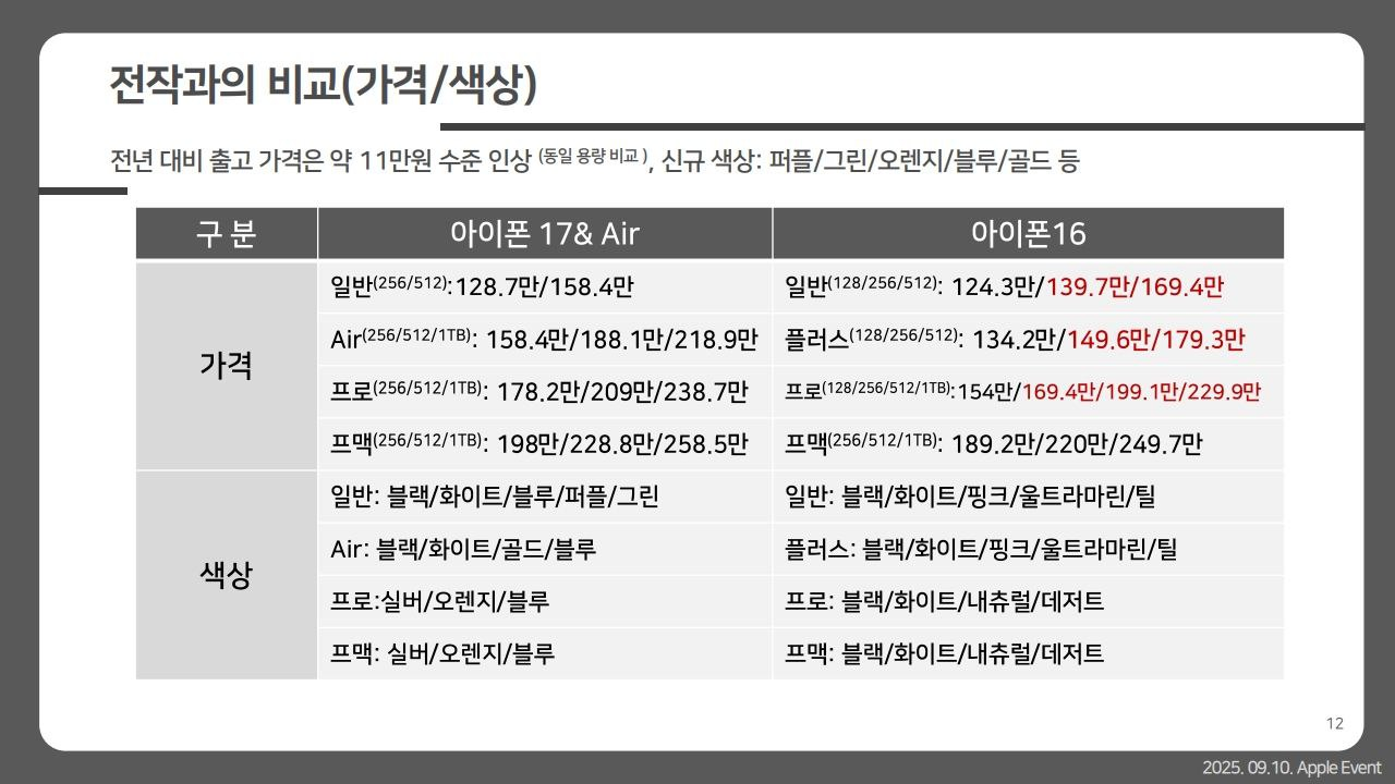📌 핵심 포인트: 기본 모델은 129만 원, 에어 159만 원, 프로 179만 원, 프로맥스 199만 원부터 시작합니다. 용량 업그레이드 시 약 30만 원씩 추가되며, 기존 128GB 모델은 출시되지 않아 기본 저장 용량이 2배로 올라갔습니다!