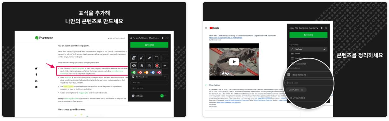 웹페이지 전체, 선택 영역, 기사, 북마크 등 다양한 방식으로 클리핑할 수 있습니다. 클리핑 시 메모 추가, 하이라이트, 태그 달기 기능으로 필요한 정보에 주석을 달 수 있으며, Evernote 클라우드에 저장되어 모든 기기에서 동기화됩니다.
