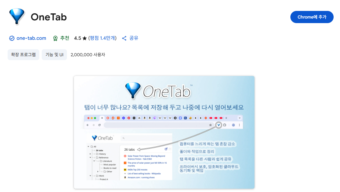 | OneTab | 탭 정리, 메모리 절약 | 브라우저 관리 |