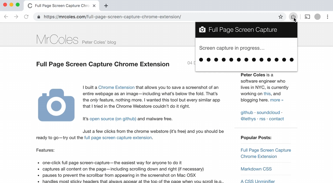 캡처할 페이지로 이동 후, 아이콘 클릭 또는 단축키 Alt + Shift + P (윈도우) / Option + Shift + P (맥)를 누르면 자동 스크롤 캡처가 시작됩니다. 캡처가 완료되면 새 탭에서 PNG/JPEG/PDF 다운로드 또는 드래그 저장이 가능합니다.