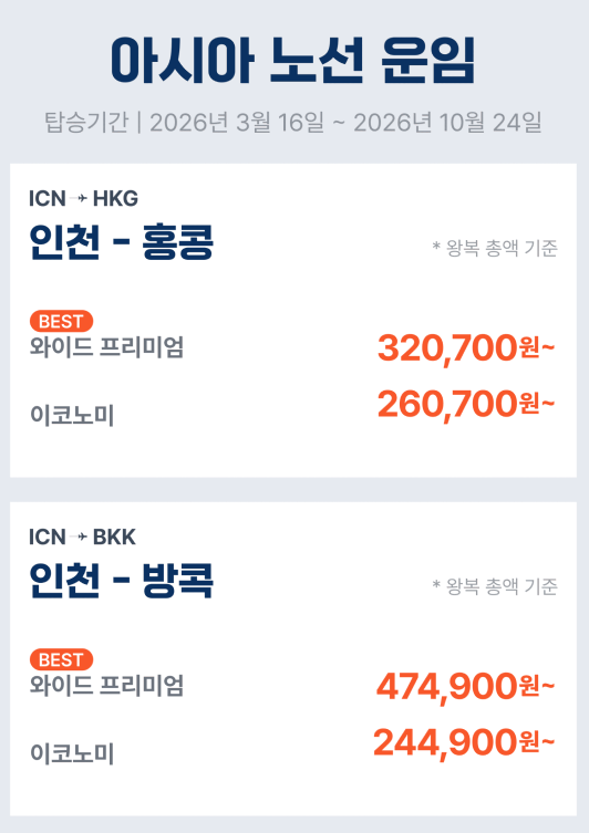 | 아시아 최저가 | 왕복 205,600원~ (유류할증료·공항세 포함) |