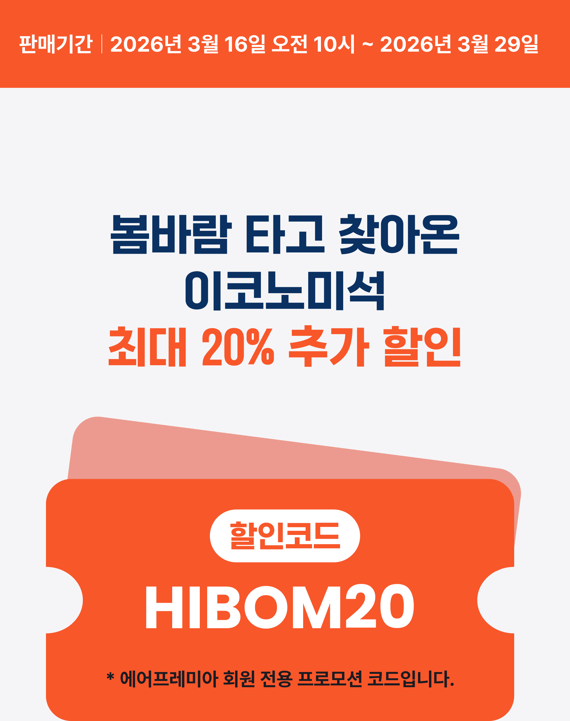 | 이코노미 할인코드 | HIBOM20 (이코노미 운임 20% 추가 할인) |