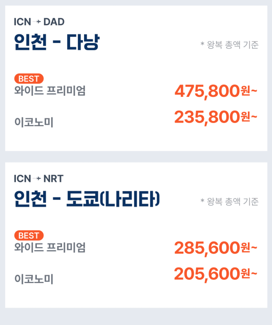 | 인천 → 다낭 🏖️ | 235,800원~ | 475,800원~ |