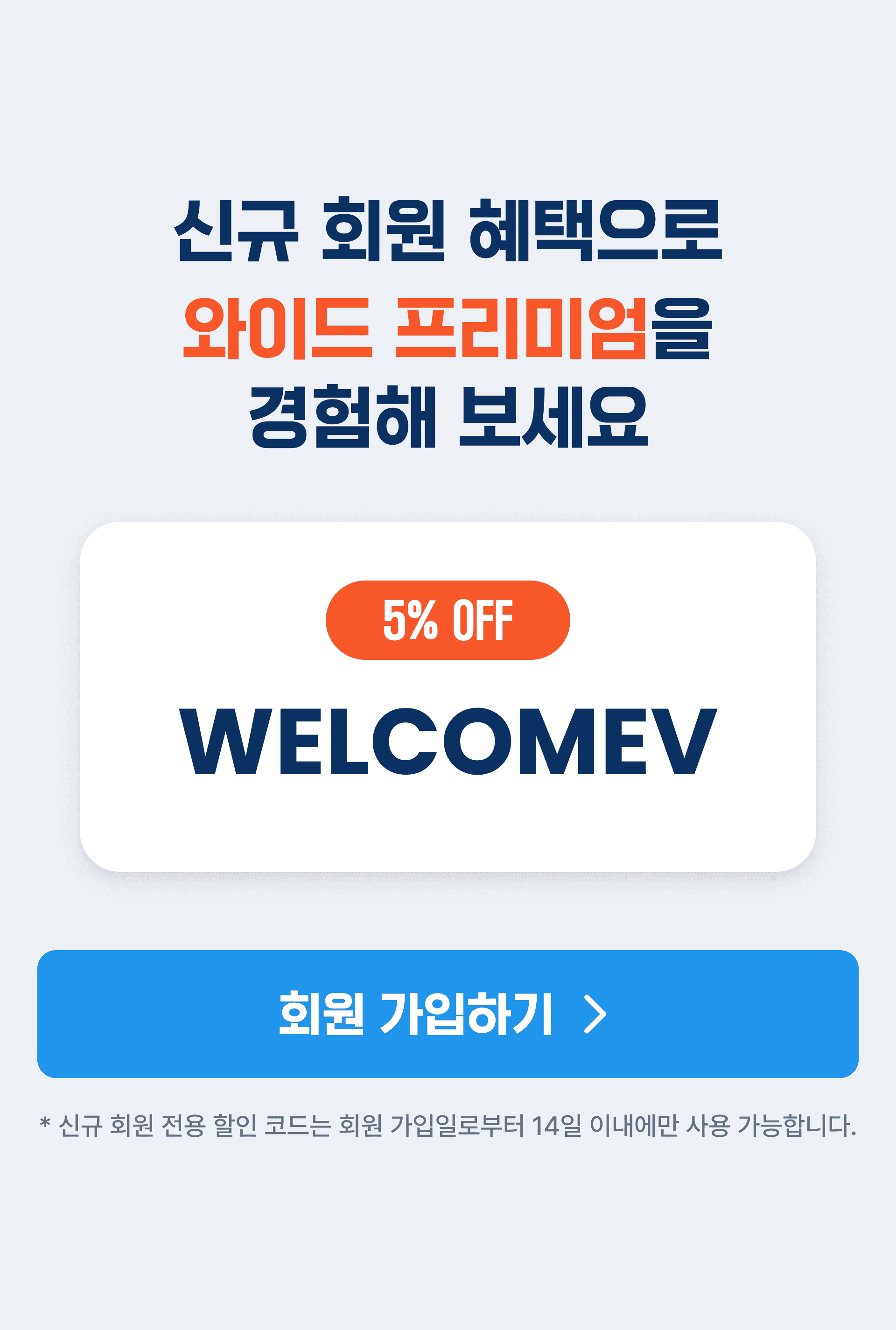 | 신규 회원 코드 | WELCOMEV (와이드 프리미엄 5% 할인, 가입 14일 이내) |