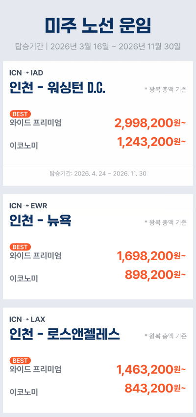 | 미주 최저가 | 왕복 605,600원~ (유류할증료·공항세 포함) |
