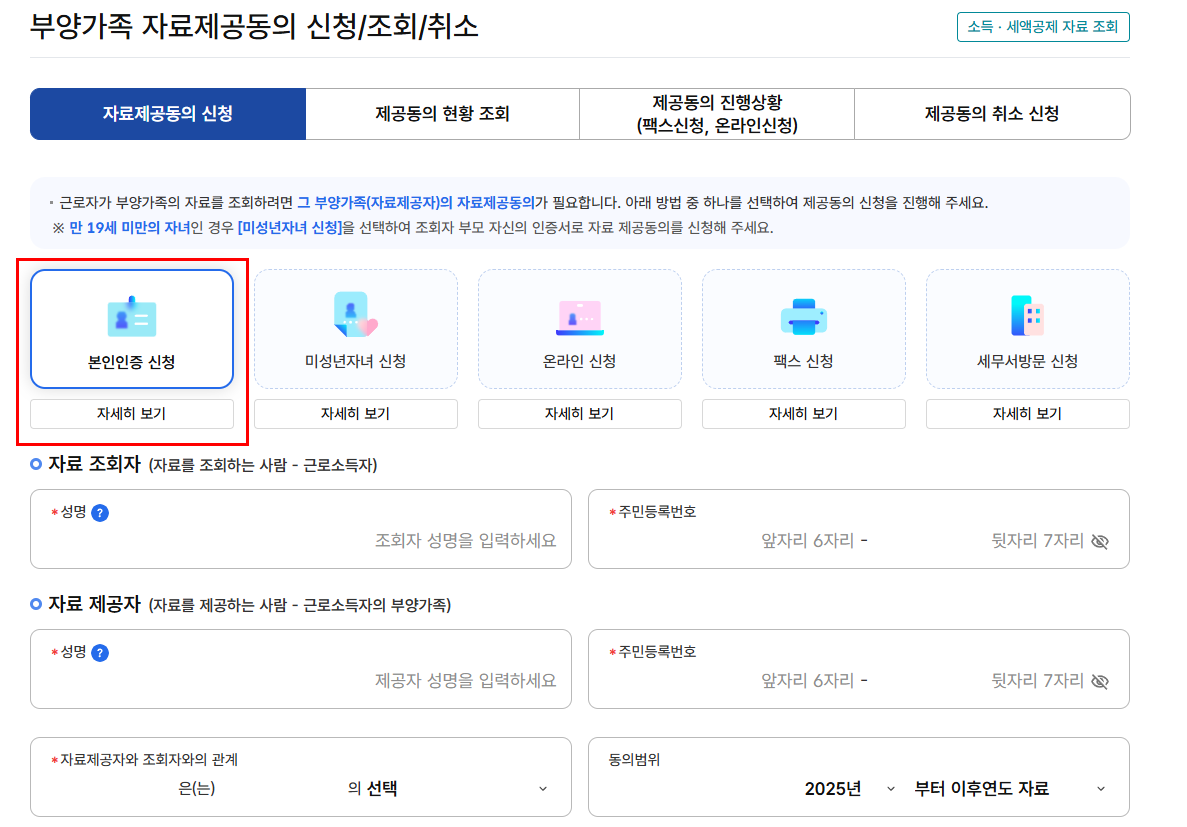 • [연말정산간소화] → [부양가족 자료제공동의 신청/조회/취소]