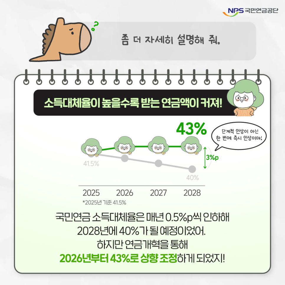은퇴 후 받는 연금액이 은퇴 전 평균 소득의 41.5%에서 43%로 올라갑니다.