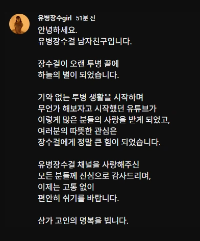 "유병장수걸 채널을 사랑해 주신 모든 분들께 진심으로 감사드립니다. 이제는 고통 없이 편안히 쉬기를 바랍니다. 삼가 고인의 명복을 빕니다."