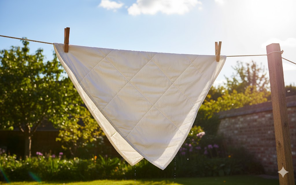 이불을 널 때 네모반듯하게 펼치지 말고, 삼각형이 되도록 널어주세요. 삼각형 모양으로 널면 물기가 모서리로 빠져나가면서 건조 시간을 크게 단축할 수 있습니다.