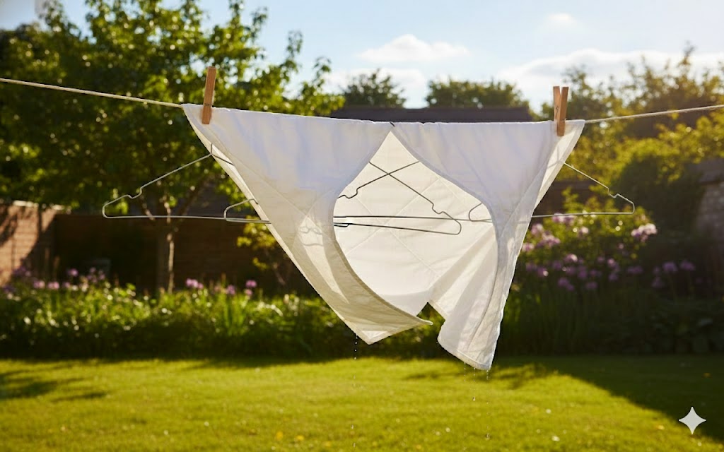 이불을 널 때 네모반듯하게 펼치지 말고, 삼각형이 되도록 널어주세요. 삼각형 모양으로 널면 물기가 모서리로 빠져나가면서 건조 시간을 크게 단축할 수 있습니다.