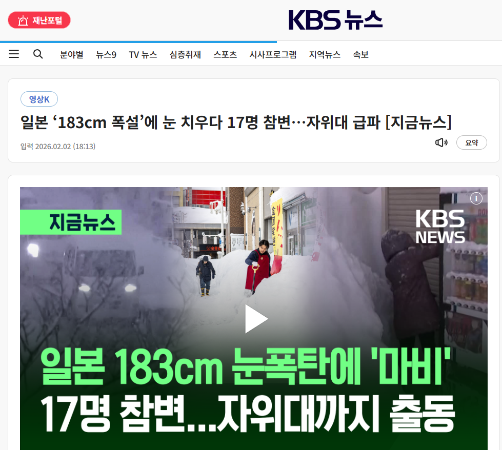 2026년 2월 2일 현재, 일본 북부 아오모리현에 성인 키만한 183cm의 눈이 쌓이면서 제설 작업 중 17명이 목숨을 잃었습니다.