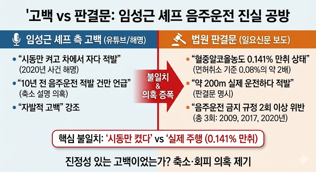 | 1/19(일) | 판결문 확인 보도에서 고백 내용과 다른 정황(특히 2020년 사건)이 부각 | 논란이 "음주운전 고백"에서 "고백의 정확성/축소 여부"로 확장됨 |