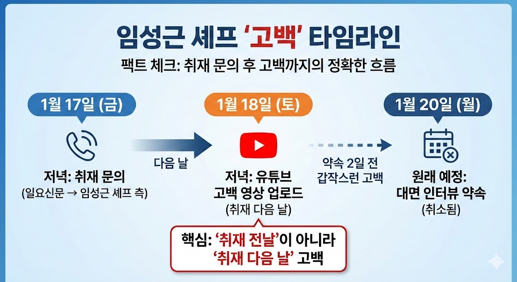실제로 일요신문 보도를 보면, 1월 17일 저녁에 임성근 셰프 측에 취재 문의가 들어갔고