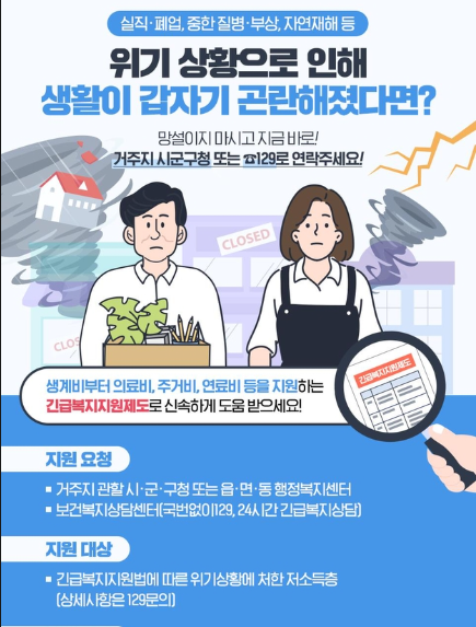 • 온라인: 복지로(bokjiro.go.kr) → 긴급복지지원 신청