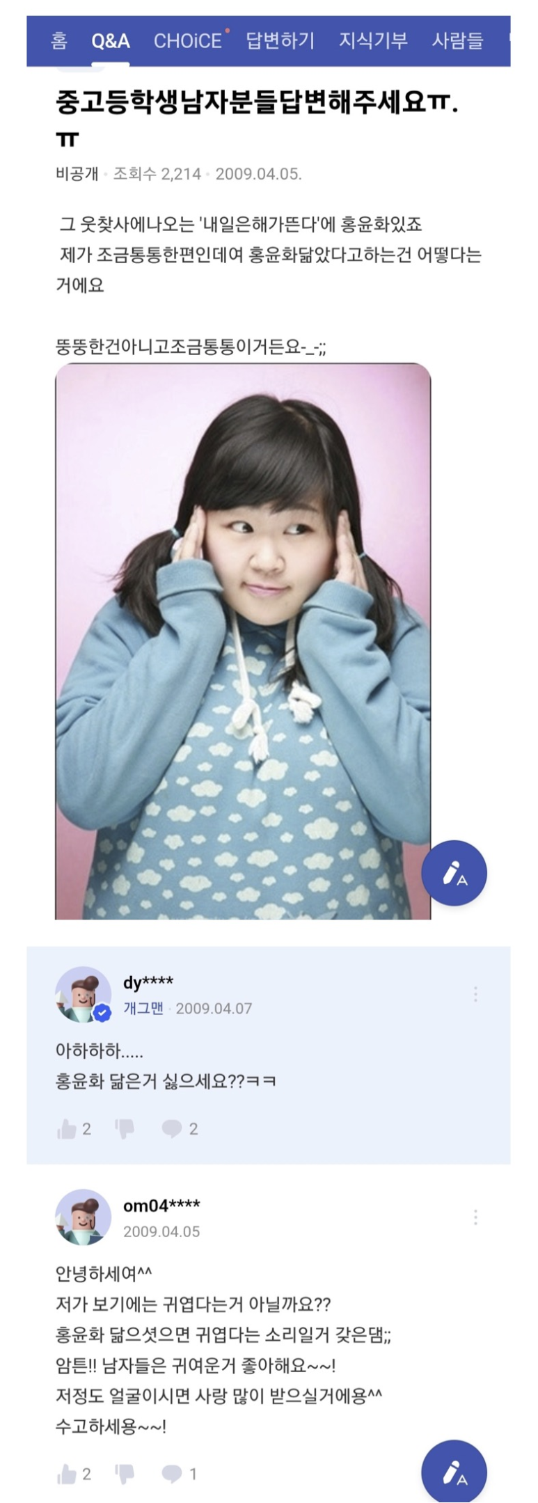 개그우먼 홍윤화의 지식인 활동도 눈길을 끌었습니다. 홍윤화를 닮았다는 한 네티즌의 질문에 긍정적인 답변을 남겨주었는데, 그녀의 밝고 발랄한 캐릭터에 딱 맞는 답변이라는 평이 많았죠.