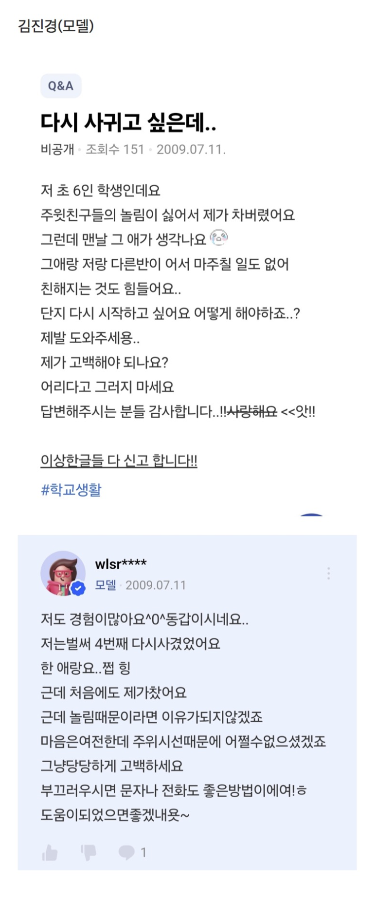 참고: 대부분 초등학생부터 대학생 시절의 순수했던 답변들로, 연애 고민, 옷차림 추천, 영어 표현 등 일상적인 질문에 성실히 답변한 내용이 주를 이룹니다.