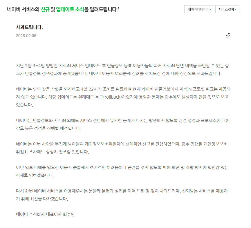 최수연 네이버 대표는 이번 지식인 비공개 답변 및 프로필 유출 사고에 대해 공식적인 사과 입장을 발표했습니다.