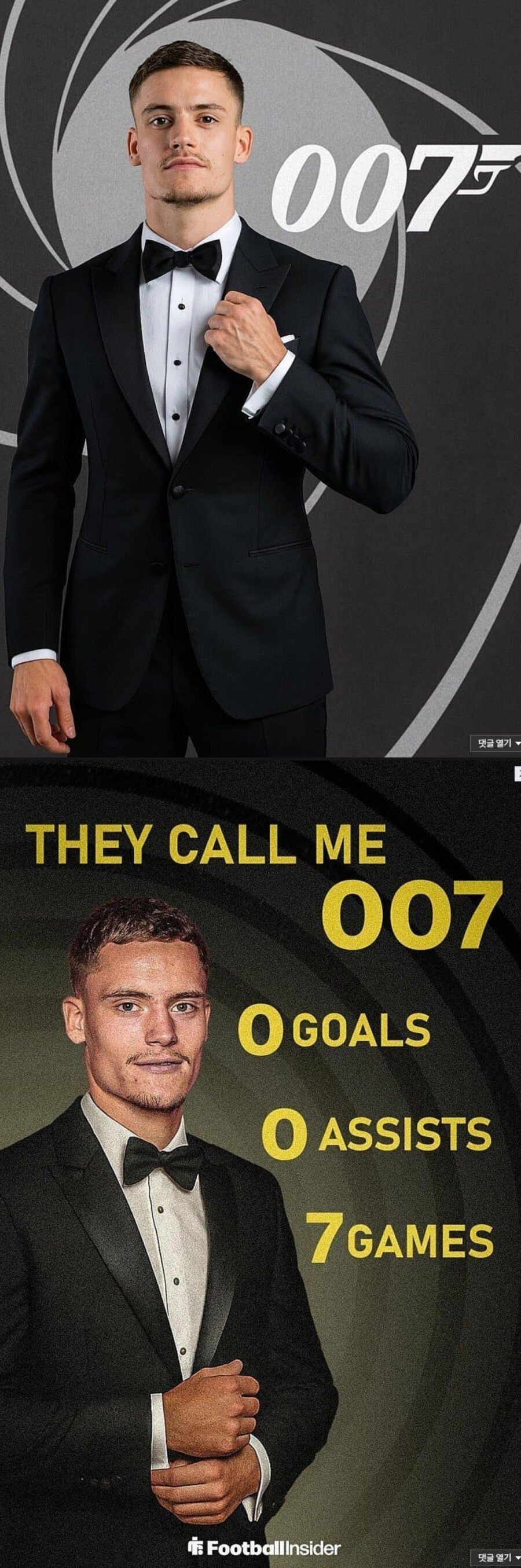 "007 밈은 과거 맨체스터 유나이티드 시절 제이든 산초가 당했던 조롱과 똑같습니다. 당시 산초도 부진에 빠지자 팬들이 '007'이라고 비아냥댔죠. 비르츠가 이 악순환을 끊을 수 있을지 주목됩니다."