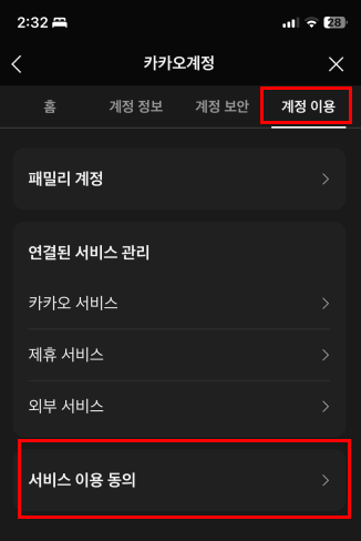 4. '계정 이용' - '서비스 이용 동의' 선택