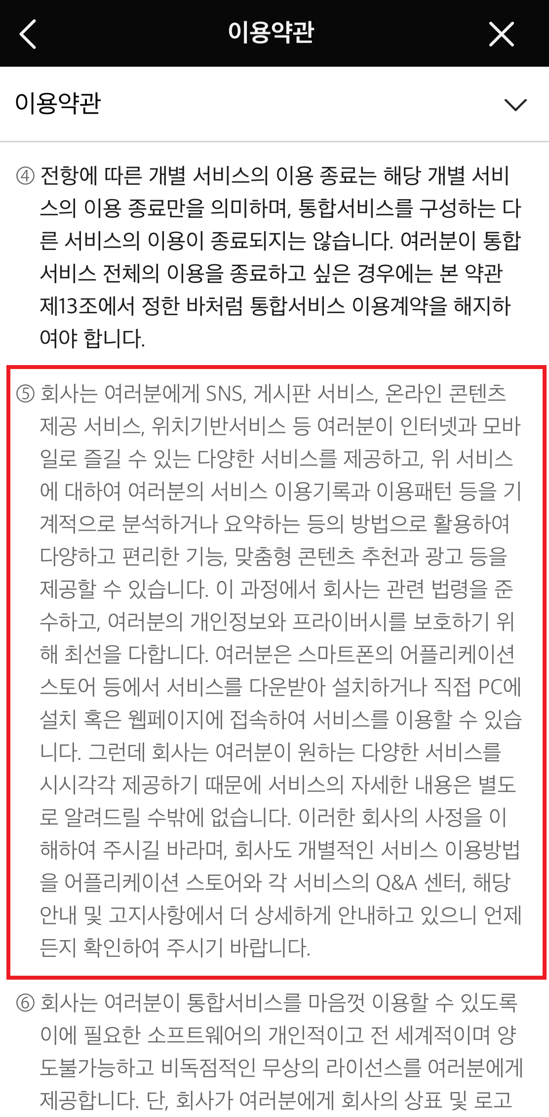 개정 약관에 동의하지 않으면 카카오톡 이용 계약이 해지되거나 서비스 이용이 사실상 중단됩니다.