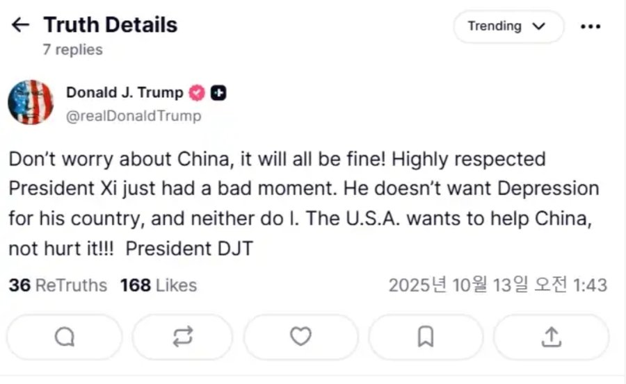 2025년 10월 13일 오전 1시 43분(한국시간), 트럼프 대통령이 트루스소셜에 올린 포스트가 시장을 완전히 뒤집었습니다.
