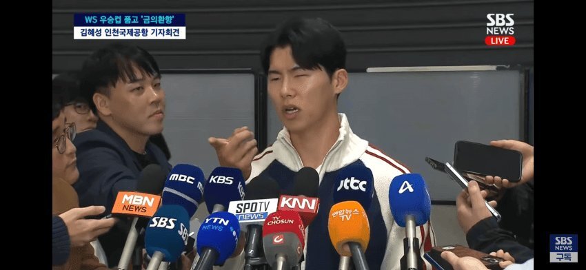 김혜성이 입국 기자회견 중 불편한 기색을 보이고 있다. (SBS뉴스 캡처)