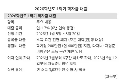 교육부 발표에 따르면, 2026년 1학기 학자금대출 금리는 연 1.7%로 동결되었습니다.