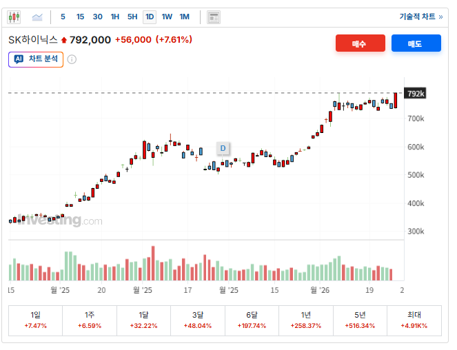 차트상 SK하이닉스는 명확한 상승추세를 형성 중입니다. 5일선(약 76만원), 20일선(약 70만원), 60일선(약 60만원)이 모두 위쪽을 향하는 3중 골든크로스 형태로, 단기·중기·장기 모두 강한 매수세를 보여줍니다.