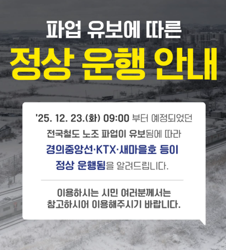 다행히 12월 23일 새벽, 전국철도노동조합이 파업을 유보하겠다고 밝히면서 출근길 대란은 피할 수 있었어요.코레일(한국철도공사)의 모든 열차가 정상 운행 중이니 안심하셔도 됩니다.