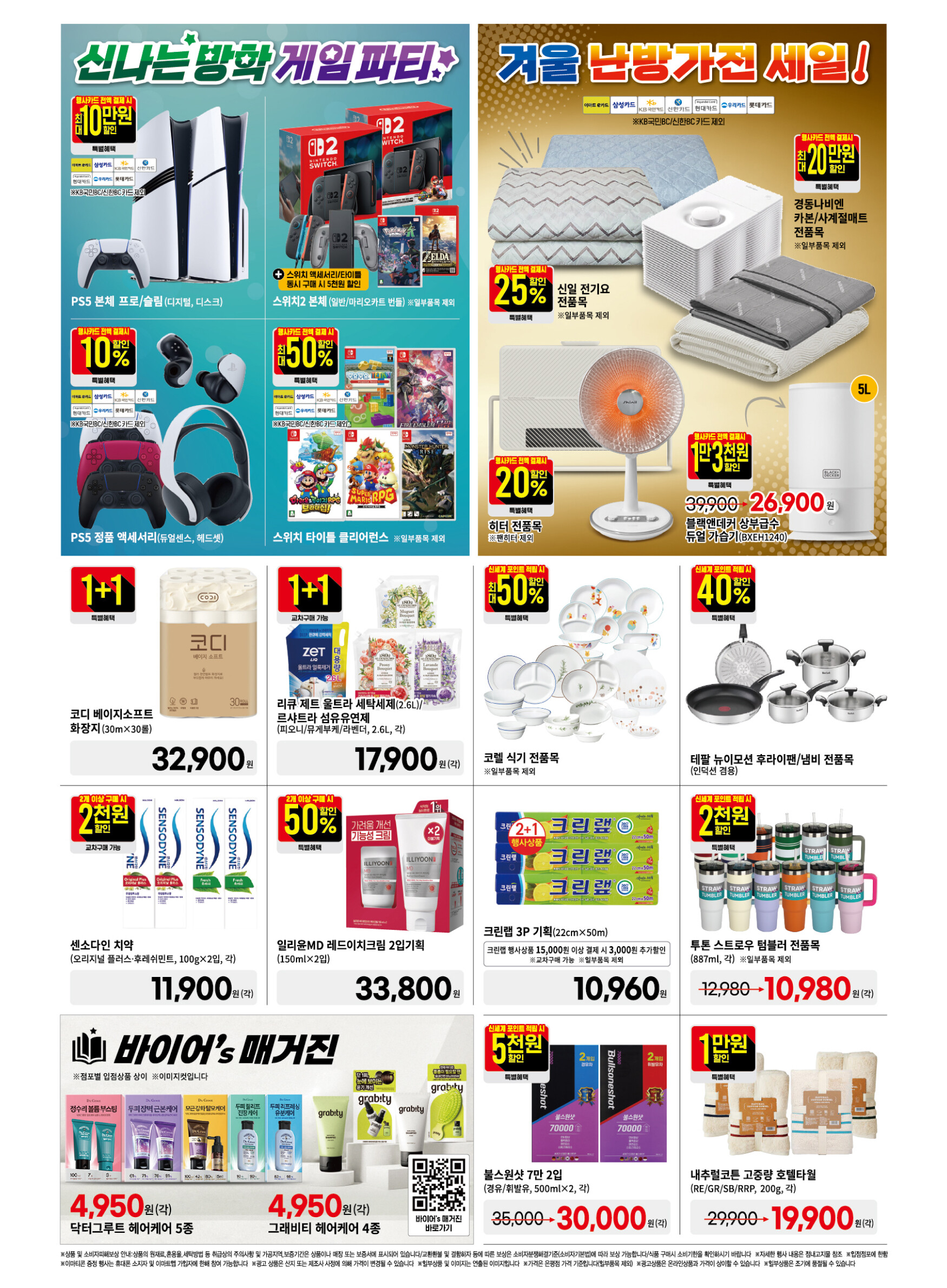 이번 페이지는 '방학 시즌 가전'과 '생활필품 1+1 쟁이기'의 끝판왕입니다. 특히 PS5 Pro와 신형 스위치 등 고가 가전의 카드 할인 폭이 커서 매우 유리한 구성입니다.